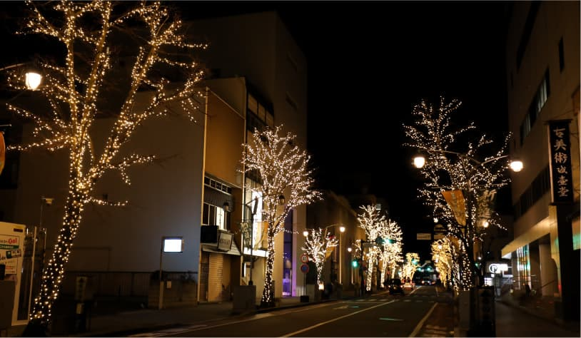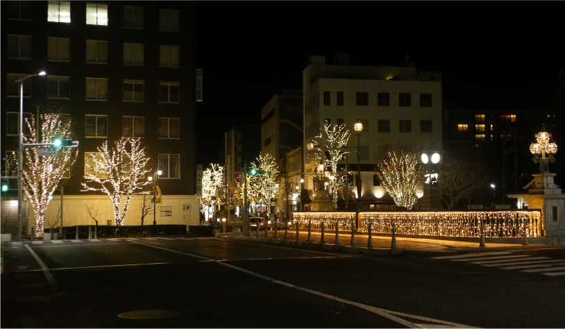 松本城公園に通じる千歳橋から大名町通りの一本道に優しく温かな光が灯り、冬の「まつもと」を照らします。大名町通りは華やかな木の電飾が皆さんをお迎えし、千歳橋ではガス灯とマッチしたイルミネーションが松本の夜を飾ります。松本でしか体験できない非日常の空間へ、ぜひ足をお運びください。